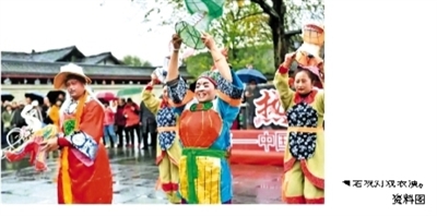 老观不仅有储蓄物质文明的古代粮仓,也有洋溢精神文明的现代舞台。听,锣鼓响起来了,胡琴声响起来了——一个丑角、一个旦角粉墨登台,灯戏开场啰!